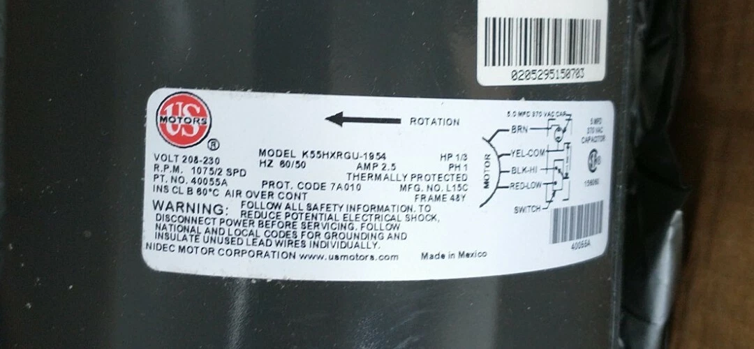 Product Name | BLOWER FAN MOTOR HP-1/3, RPM-1075/2SPD, AMPS-2.5, PHASE-1 |